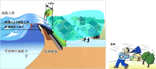 海面が防潮堤の天端を1m越えたとすると、長さ1m当たり1秒間に約3緕・の海水が流れ込みます。 これが防潮堤の100m区間で越流したとすると、30分という僅かな時間で、防潮堤背後の面積17haが浸水します。 ※ 引用文献「高潮って恐ろしい」高山 知司、京都大学防災研究所、2000予防時報201
