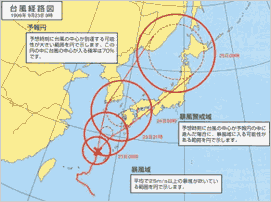 台風の中心位置、気圧、最大風速、進路予想、高潮など、台風の状況に関する情報です。