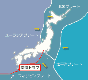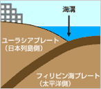 地震には大きく分けて、海溝やトラフ沿いが震源となる「海溝型」と、陸の活断層が震源となる「直下型」の2種類あり、津波は「海溝型」で発生します。